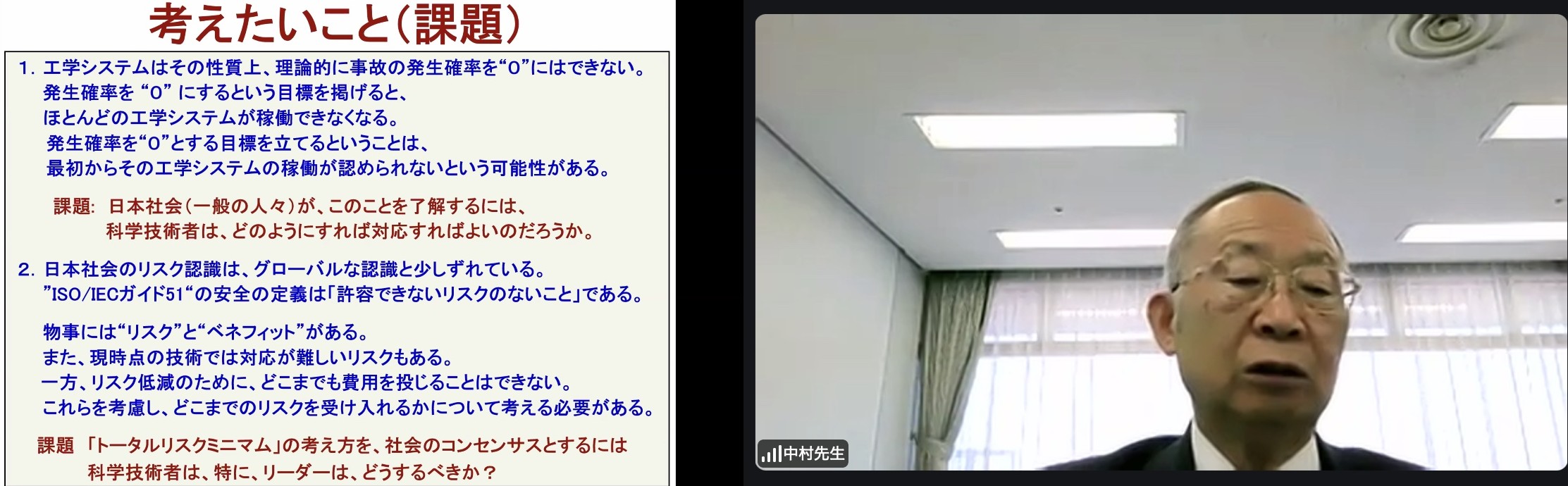 (1) 講演1:「ALARPの原則と日本の安全管理の実情」中村昌允氏(化学)